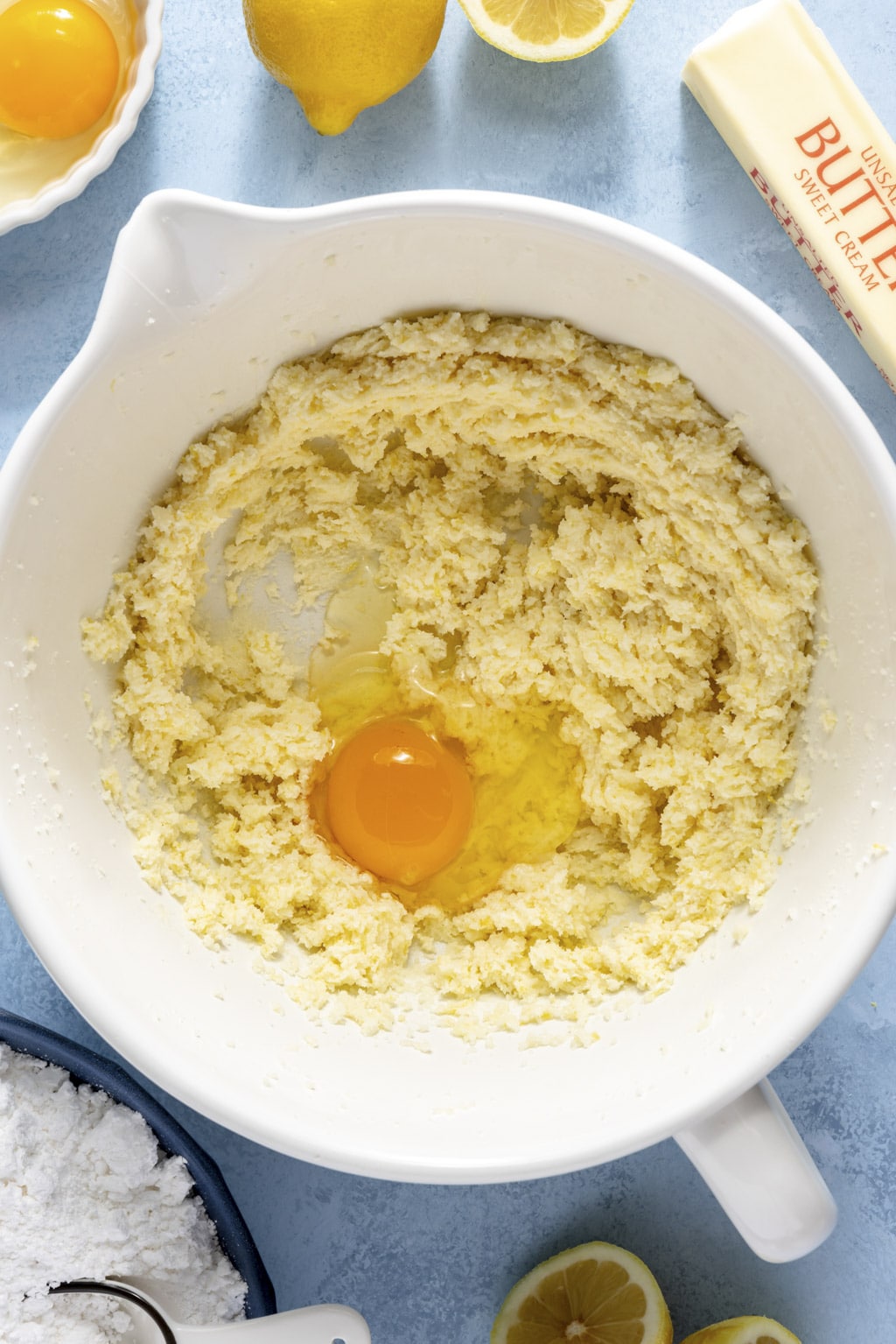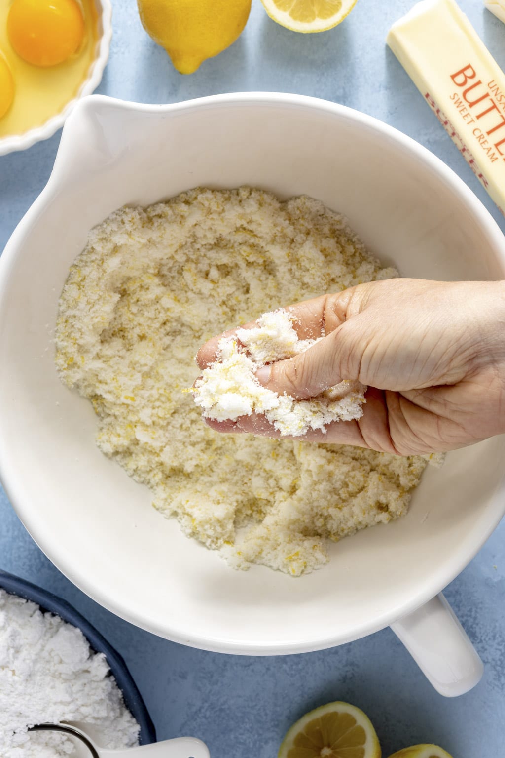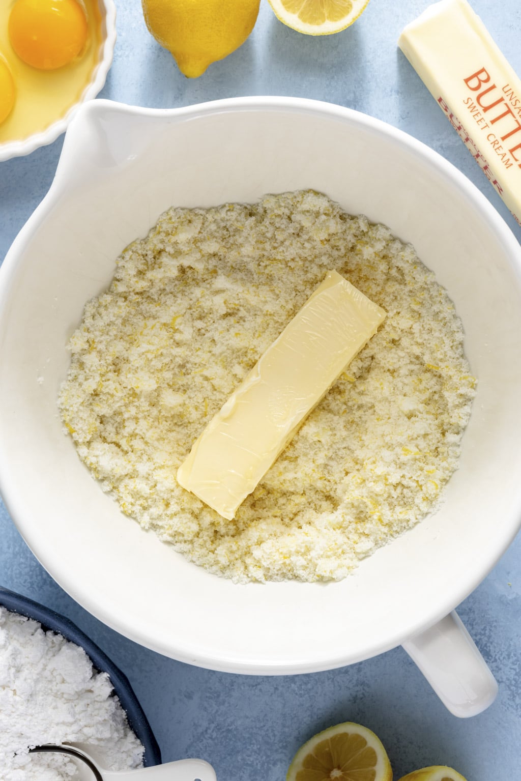 - Beat the butter and sugar together. Combine the sugar and lemon zest in a large mixing bowl. Use your fingers to rub the lemon zest into the sugar until it’s very fragrant. Add the butter and use a hand mixer to cream the butter and sugar together until it’s very fluffy, about 3-4 minutes. Beat the eggs in, one at a time, until smooth. Add the yellow food coloring here if you’re using it.