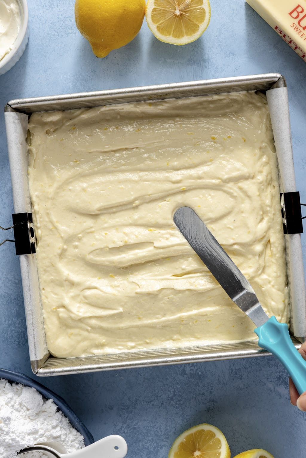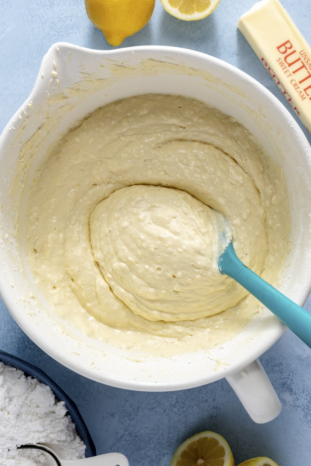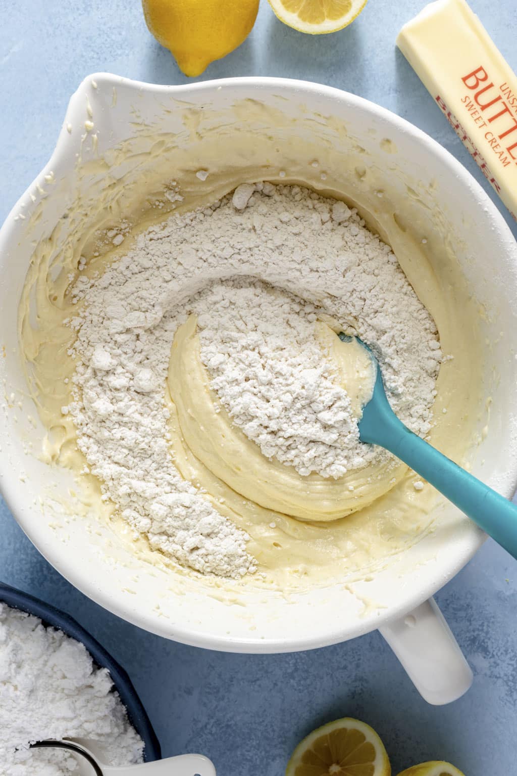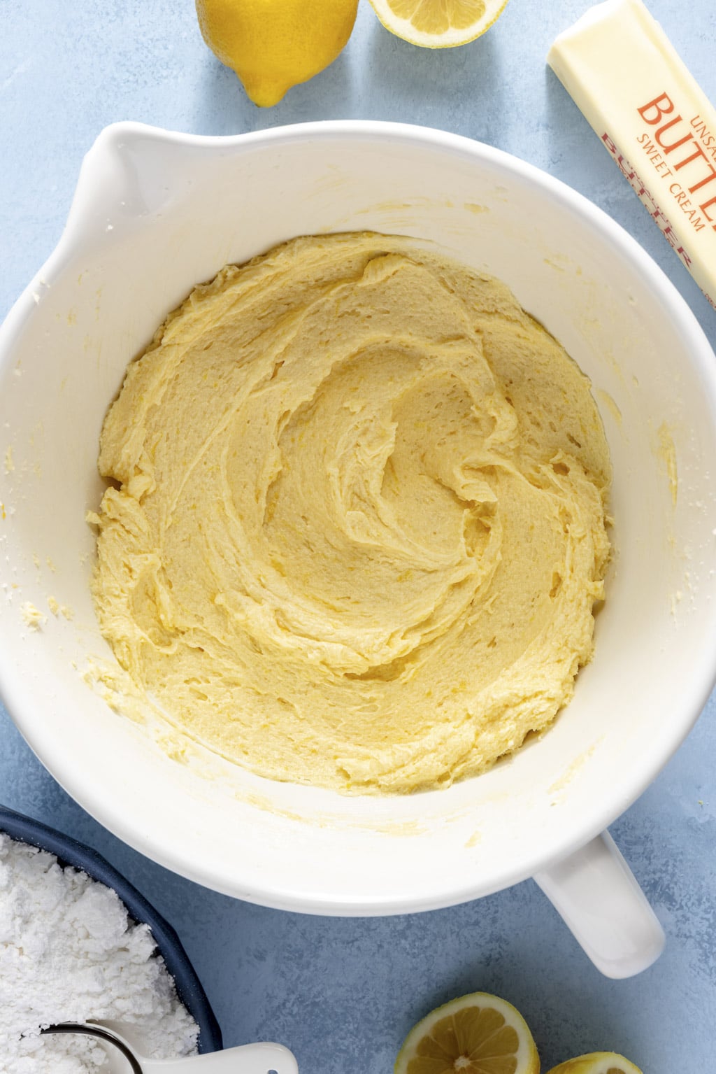- Beat the butter and sugar together. Combine the sugar and lemon zest in a large mixing bowl. Use your fingers to rub the lemon zest into the sugar until it’s very fragrant. Add the butter and use a hand mixer to cream the butter and sugar together until it’s very fluffy, about 3-4 minutes. Beat the eggs in, one at a time, until smooth. Add the yellow food coloring here if you’re using it.